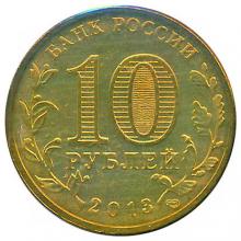 Аверс: в центре диска - обозначение номинала монеты "10 РУБЛЕЙ". Внутри цифры "0" - скрытые, видимые поочередно при изменении угла зрения изображения цифры "10" и надписи "РУБ". По окружности вдоль канта - надписи, вверху: "БАНК РОССИИ", внизу - дата: "2013", слева - стилизованное изображение оливковой ветви, справа - дубовой.