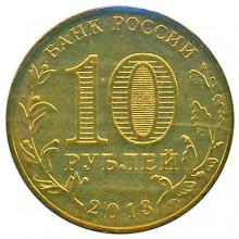 Реверс: в центре диска - обозначение номинала монеты "10 РУБЛЕЙ". Внутри цифры "0" - скрытые, видимые поочередно при изменении угла зрения изображения цифры "10" и надписи "РУБ". По окружности вдоль канта - надписи, вверху: "БАНК РОССИИ", внизу - дата: "2013", слева - стилизованное изображение оливковой ветви, справа - дубовой.