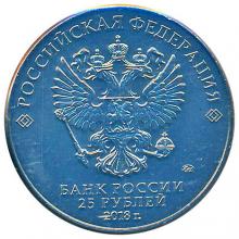 Аверс: в центре – рельефное изображение Государственного герба Российской Федерации, над ним вдоль канта – надпись полукругом: "РОССИЙСКАЯ ФЕДЕРАЦИЯ", обрамленная с обеих сторон сдвоенными ромбами, внизу под гербом в центре в три строки – надпись "БАНК РОССИИ", номинал монеты: "25 РУБЛЕЙ", год: "2018 г.", справа – товарный знак монетного двора.