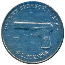 Реверсрасположено рельефное изображение пистолета ТТ, слева – надпись: "ТТ"; вдоль канта – надписи, вверху: "ОРУЖИЕ ВЕЛИКОЙ ПОБЕДЫ", внизу: "Ф.В. ТОКАРЕВ".
