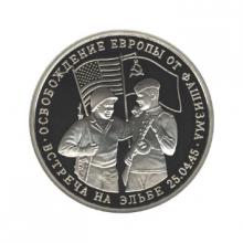 Реверс: изображение двух солдат - американского и советского- на фоне Государственных флагов США и СССР, по окружности надписи, разделённые двумя точками: вверху - "ОСВОБОЖДЕНИЕ ЕВРОПЫ ОТ ФАШИЗМА", внизу -"ВСТРЕЧА НА ЭЛЬБЕ 25.04.45". На боковой поверхности монеты - две углублённые надписи "ТРИ РУБЛЯ", разделённые двумя звёздочками.
