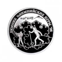 Реверс: изображениe двух спортсменов-биатлонистов: одного — в момент лыжной гонки, второго — в момент стрельбы из винтовки, на втором плане — снежная вершина горы Фудзияма. Вверху по кругу надписи: «Зимние олимпийские игры 98», ниже — «Нагано».