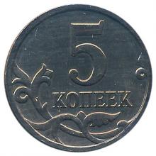 - в центре (ближе к правому краю) – обозначение номинала монеты: цифра 5, под ней - слово "КОПЕЕК", расположенное горизонтально;