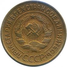 Аверс: герб СССР с семью витками перевязывающей ленты, под ним надпись "СССР", от которой начинается линейный круговой ободок.