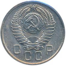 Реверс: в центре восьмиугольный щиток, в нем номинал "15 коп", написанный в две строки.