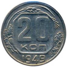 Реверс: в центре восьмиугольный щиток, в нем номинал "20 коп", написанный в две строки.