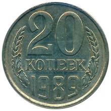 Реверс: номинал, написанный в две строки: "20 копеек", под ним дата - 1989.
