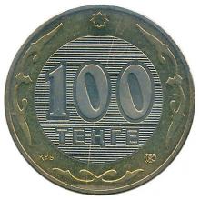 Аверс: в центре на фоне рифленого круга в две строки расположена надпись «100 ТЕЊГЕ» обозначающая номинал монеты. По окружности изображены три элемента национального орнамента, разделенные в верхней части восьмиугольной розеткой, слева надписью «Қ¦Б», справа товарным знаком Казахстанского монетного двора. По окружности - выступающий кант.