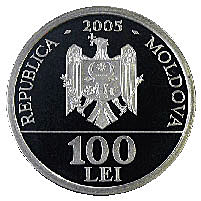 В верхней части – цифра „2005”, в нижней части – надпись „100 LEI”, по окружности монеты – заглавными буквами выгравирована надпись „REPUBLICA MOLDOVA”.