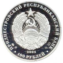 По кругу надписи: вверху – «ПРИДНЕСТРОВСКИЙ РЕСПУБЛИКАНСКИЙ БАНК», внизу – «100 РУБЛЕЙ».