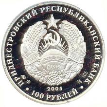 По кругу надписи: вверху – «ПРИДНЕСТРОВСКИЙ РЕСПУБЛИКАНСКИЙ БАНК», внизу – «100 РУБЛЕЙ».
