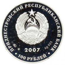 По кругу надписи: вверху – «ПРИДНЕСТРОВСКИЙ РЕСПУБЛИКАНСКИЙ БАНК», внизу – «100 РУБЛЕЙ».