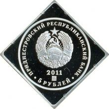 В нижней части под гербом год выпуска монеты – «2011», логотип изготовителя, обозначение металла, проба сплава, масса.