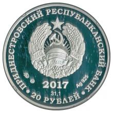 Аверс: в центре – изображение Государственного герба Приднестровской Молдавской Республики; по кругу – надписи: вверху – «ПРИДНЕСТРОВСКИЙ РЕСПУБЛИКАНСКИЙ БАНК», внизу – «20 РУБЛЕЙ»; в нижней части под гербом – год выпуска монеты «2017», ниже – содержание химически чистого металла в граммах, слева – логотип изготовителя, государственное пробирное клеймо, справа – обозначение металла, проба сплава.