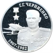 Реверс: в центре – портрет Героя Советского Союза С.К. Колесниченко в гимнастёрке; слева – изображение медали «Золотая Звезда» и двух самолётов; вверху – надпись «С.К. КОЛЕСНИЧЕНКО»; внизу – годы жизни «1913-1943».