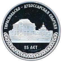 Реверс: в центре – изображение здания епархиального управления Тираспольско-Дубоссарской епархии, Собора Рождества Христова; вверху по кругу – надпись «ТИРАСПОЛЬСКО - ДУБОССАРСКАЯ ЕПАРХИЯ»; внизу – надпись «25 ЛЕТ».