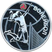 Реверс: на фоне очертаний волейбольного мяча в центре: стилизованное изображение волейболистки над сеткой в момент удара; вверху – цветное изображение волейбольного мяча; справа по кругу – надпись «ВОЛЕЙБОЛ».