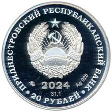 в центре – изображение Государственного герба Приднестровской Молдавской Республики; по кругу – надписи: вверху – «ПРИДНЕСТРОВСКИЙ РЕСПУБЛИКАНСКИЙ БАНК», внизу – «20 РУБЛЕЙ»; в нижней части под гербом – год выпуска монеты «2024», ниже – содержание химически чистого металла в граммах, слева – логотип изготовителя, справа – обозначение металла, проба сплава.