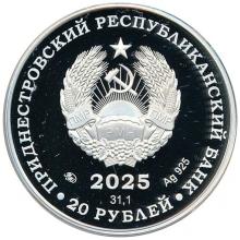 Аверс монеты: в центре – изображение Государственного герба Приднестровской Молдавской Республики, под гербом – в две строки год выпуска «2025» и содержание химически чистого металла в граммах, слева – логотип изготовителя, справа – обозначение металла, проба сплава; по кругу – надписи: вверху – «ПРИДНЕСТРОВСКИЙ РЕСПУБЛИКАНСКИЙ БАНК», внизу – номинал монеты «20 РУБЛЕЙ».