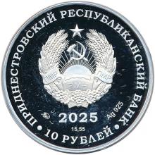 в центре – изображение Государственного герба Приднестровской Молдавской Республики, под гербом – в две строки год выпуска «2025» и содержание химически чистого металла в граммах, слева – логотип изготовителя, справа – обозначение металла, проба сплава; по кругу – надписи: вверху – «ПРИДНЕСТРОВСКИЙ РЕСПУБЛИКАНСКИЙ БАНК», внизу – номинал монеты «10 РУБЛЕЙ».