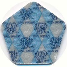 Реверс: ромбовидная сетка с нанесением логотипа «ПРБ», под ним – обозначение номинала «ПЯТЬ РУБЛЕЙ», в нижнем правом углу логотипа – год образца «2014».