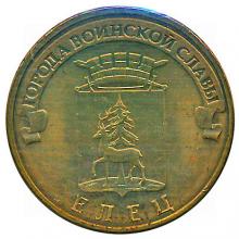 Реверс: герб города Елец, над ним, на ленте - надпись полукругом: "ГОРОДА ВОИНСКОЙ СЛАВЫ", внизу, вдоль канта - надпись: "ЕЛЕЦ".