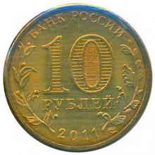 Аверс: в центре диска - обозначение номинала монеты "10 РУБЛЕЙ". Внутри цифры "0" - скрытые, видимые поочередно при изменении угла зрения изображения цифры "10" и надписи "РУБ". По окружности вдоль канта - надписи, вверху: "БАНК РОССИИ", внизу - дата: "2011", слева - стилизованное изображение оливковой ветви, справа - дубовой.
