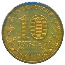 Аверс: в центре диска - обозначение номинала монеты "10 РУБЛЕЙ". Внутри цифры "0" - скрытые, видимые поочередно при изменении угла зрения изображения цифры "10" и надписи "РУБ". По окружности вдоль канта - надписи, вверху: "БАНК РОССИИ", внизу - дата: "2013", слева - стилизованное изображение оливковой ветви, справа - дубовой.