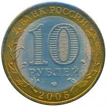 Аверс: в центре диска – обозначение достоинства монеты «10 РУБЛЕЙ». Внутри цифры «0» – скрытые, видимые поочередно при изменении угла зрения изображения цифры «10» и надписи «РУБ». В нижней части диска – товарный знак монетного двора. В верхней части кольца по окружности – надпись: «БАНК РОССИИ», в нижней – дата «2005», слева и справа – стилизованные ветви растений, переходящие на диск.