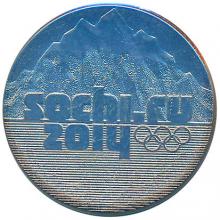 Реверс: в средней части диска, на фоне рельефного изображения горы - горизонтальная надпись: "sochi.ru", под ней, на участке тени, отбрасываемой горой - дата: "2014" и пять олимпийских колец.