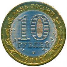 Аверс: на диске в центре – обозначение номинала монеты: "10 РУБЛЕЙ", внутри цифры "0" – скрытые, видимые поочередно при изменении угла зрения изображения числа "10" и надписи "РУБ", внизу – товарный знак монетного двора; на кольце вверху – надпись: "БАНК РОССИИ", внизу – год выпуска "2016", слева и справа – стилизованные ветви растений, переходящие на диск.