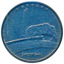 Реверс: в центре диска – изображение скульптурной композиции, являющейся частью мемориала "Курган Славы", на фоне контурных изображений архитектурных сооружений Минска, ниже – горизонтальная надпись: "3 ИЮЛЯ 1944 г." вверху вдоль канта – надпись: "МИНСК".