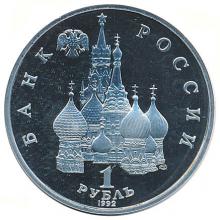 Аверс: в центре диска - изображения куполов собора Покрова на рву и Спасской башни, слева над ними - двуглавый орёл, справа под ними - товарный знак монетного двора, по окружности - надписи: вверху - "БАНК РОССИИ", внизу в три строки - "1 РУБЛЬ" "1992".
