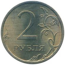 - в центре (ближе к левому краю) – обозначение номинала монеты: цифра 2, под ней - слово "РУБЛЯ", расположенное горизонтально;