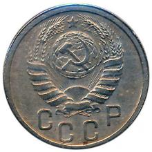 Реверс: герб СССР с семью витками перевязывающей ленты. Под ним полукругом со ступенчатым расположением букв надпись "СССР".