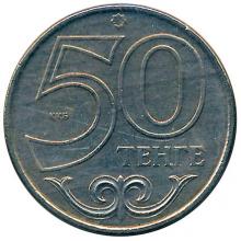 Аверс: в центральной части расположена цифра "50". Под цифрой номинала надпись "ТЕҢГЕ". В верхней части изображена орнаментальная восьмиугольная розетка. В нижней части изображен элемент национального орнамента. По окружности выступающий кант.