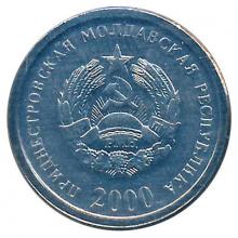 Аверс: Герб Приднестровской Молдавской Республики - изображение скрещенных серпа и молота, символизирующих единство рабочих и крестьян, в лучах солнца, восходящего над Днестром, обрамлённых по окружности гирляндой из колосьев и початков кукурузы, фруктов, виноградных гроздей и лоз, листьев, перевитых лентой с аббревиатурами названия государства на перевязи на трёх языках: на правой стороне — «Приднестровская Молдавская Республика» (ПМР); на левой стороне — «Придністровська Молдавська Республіка» (ПМР); на средней части — «Република Молдовеняскэ Нистрянэ» (РМН). В верхней части между сходящимися концами гирлянды изображена пятиконечная звезда с гранями, под ним – год выпуска. Круговая надпись: ПРИДНЕСТРОВСКАЯ МОЛДАВСКАЯ РЕСПУБЛИКА.