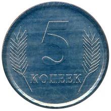 Реверс: номинал "5 КОПЕЕК" в две строки, слева и справа - колосья пшеницы.