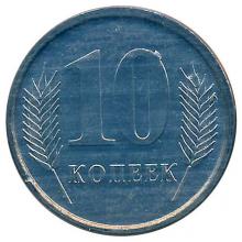 Реверс: номинал "10 КОПЕЕК" в две строки, слева и справа - колосья пшеницы.