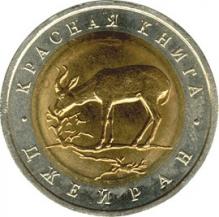 Реверс: рельефное изображение джейрана на фоне растительности, по окружности - надписи, разделённые двумя точками: вверху - "КРАСНАЯ КНИГА", внизу - "ДЖЕЙРАН".