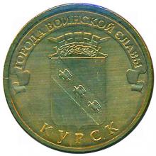 Реверс: герб города Курска, над ним, на ленте - надпись полукругом: "ГОРОДА ВОИНСКОЙ СЛАВЫ", внизу, вдоль канта - надпись: "КУРСК".