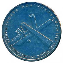 Реверс: рельефное изображение противотанковых "ежей" – Монумента защитникам Москвы, вдоль канта – надписи, разделенные двумя звездочками, вверху: "БИТВА ПОД МОСКВОЙ", внизу: "ВЕЛИКАЯ ОТЕЧЕСТВЕННАЯ ВОЙНА 1941-1945 гг.".
