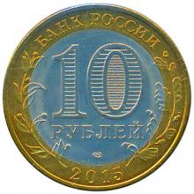 Аверс: в центре диска – обозначение номинала монеты: "10 РУБЛЕЙ", внутри цифры "0" – скрытые, видимые поочередно при изменении угла зрения изображения числа "10" и надписи "РУБ", в нижней части диска – товарный знак монетного двора, на кольце вдоль канта вверху – надпись: "БАНК РОССИИ", внизу – год выпуска: "2015", слева и справа – стилизованные ветви растений, переходящие на диск.