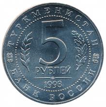 Аверс: в центре диска - надпись в две строки: "5 РУБЛЕЙ", - слева и справа от неё - лавровая и дубовая ветви, под словом "РУБЛЕЙ", в центре прерывистой линии - товарный знак монетного двора, ниже - дата: "1993".