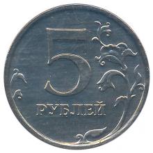 - в нижней части диска, под орлом – буквенное обозначение номинала в одну строку: "ПЯТЬ РУБЛЕЙ", подчеркнутое горизонтальной линией, разделенной посередине точкой;