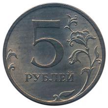 - в нижней части диска, под орлом – буквенное обозначение номинала в одну строку: "ПЯТЬ РУБЛЕЙ", подчеркнутое горизонтальной линией, разделенной посередине точкой;