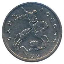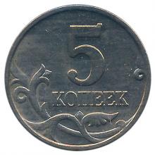 - в центре (ближе к правому краю) – обозначение номинала монеты: цифра 5, под ней - слово "КОПЕЕК", расположенное горизонтально;