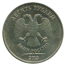 - в центре (со смещением к левому краю на фоне поля из вертикальных линий) - обозначение номинала монеты: число "10", под числом – слово "РУБЛЕЙ";