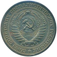 Реверс: в середине герб СССР с пятнадцатью витками перевязывающей ленты, обрамленный круговым ободком из сдвоенной линии. Между ним и обрезом монеты надпись "Союз Советских Социалистических Республик". Начало и окончание надписи разделено звездочкой.
