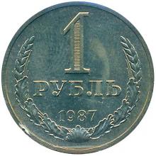 Аверс: в середине монетного поля номинал, написанный в две строки: "1 рубль", под ним - дата. По бокам венок, верхнюю часть которого составляют колосья, нижнюю - дубовые листья, соединенные внизу декоративной ракушкой.